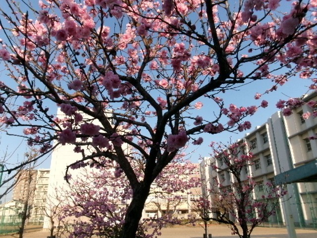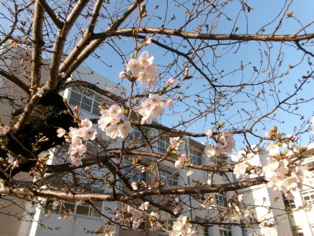 昨日大阪でもソメイヨシノの開花宣言があったようですが、本校中庭は、ちらほら咲きです。入学式にはもっと咲いて新入生を迎えてほしいものです。満開になっているのはハナモモです。