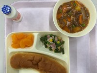 おさつパンビーフシチューベーコンと三度豆のソテーみかん缶発酵乳牛乳