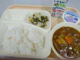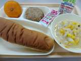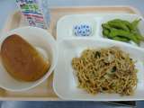 今日の献立は「黒糖パン(小)、オイスターソース焼きそば、枝豆、固形チーズ、牛乳...