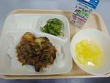 今日の献立は「マーボーあつあげ丼、あっさりきゅうり、りんご(カット缶)、牛乳」...