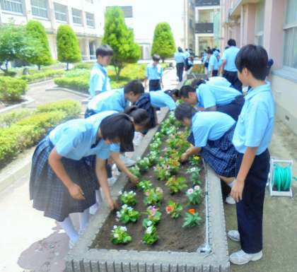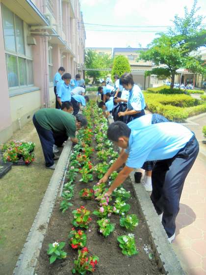中庭 環境委員で花苗の植え付けを行いました。