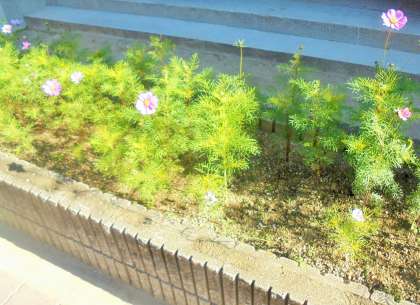 中庭 季節はずれで、秋桜の花が咲いてきました。