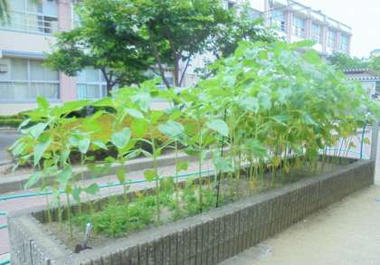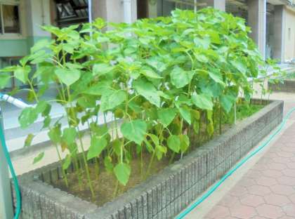中庭 ヒマワリの茎が成長してきました。