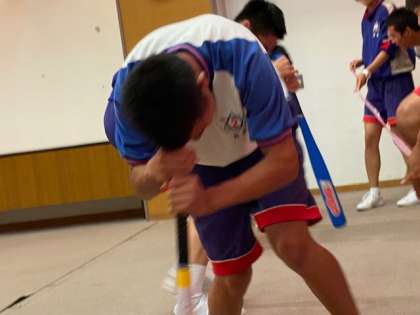 バットに額を当てて15回まわり、コーンを回ってゴールを目指します!