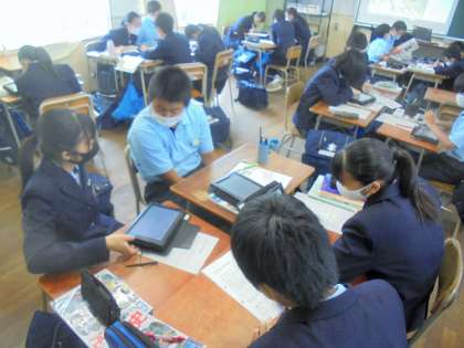 2年生 社会 タブレットを使用したグループ学習の様子です。