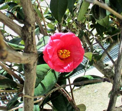 体育館横 椿(ツバキ)の花が咲いています。