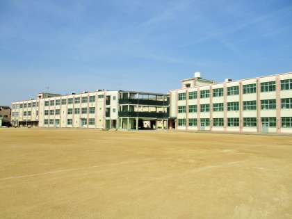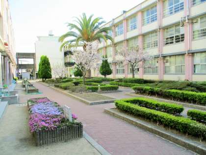生徒を迎える校舎、きれいな中庭に、春の日差しが降り注ぎます。