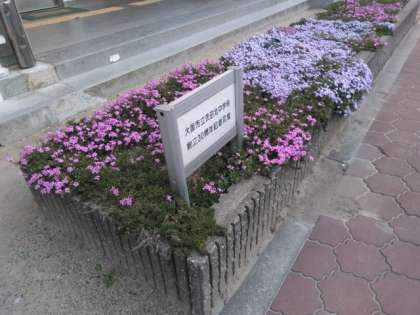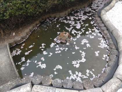校庭の池を眺めると、桜の花びらと金魚が心に潤いを与えてくれています。