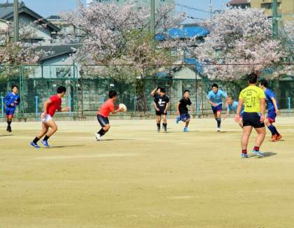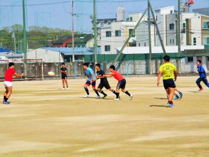 楕円形のボールを追って、若さ溢れるエネルギーが躍動しています。