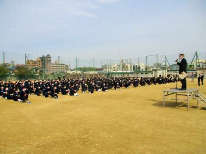 コロナ感染防止対策で、晴天の運動場で始業式を行いました。