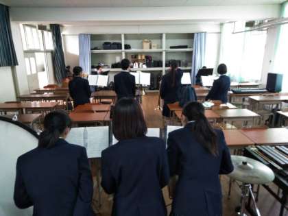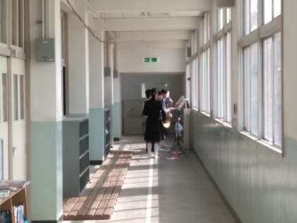 校舎のあちこちに分散して、吹奏楽部が練習しています。