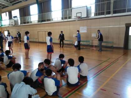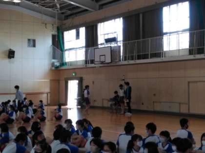 体育館では、視力検査と身体計測が行われています。