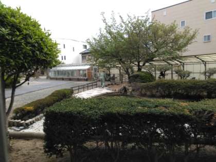 築山や正門前の校庭は広く、年中落葉など清掃やお手入れが大変です。