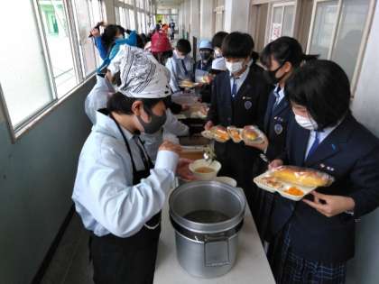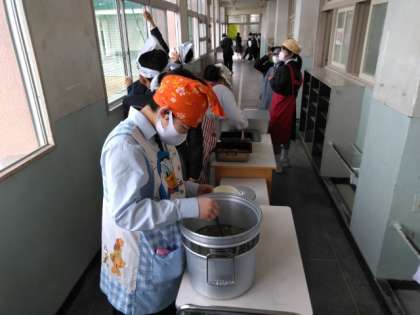 午前の授業が終了し、給食の準備に入りました。