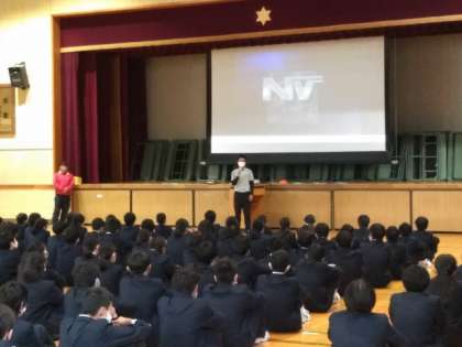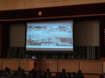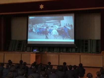 その1回目。体育館で、東日本大震災時の津波についての映像を見て学習しました。