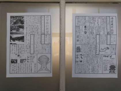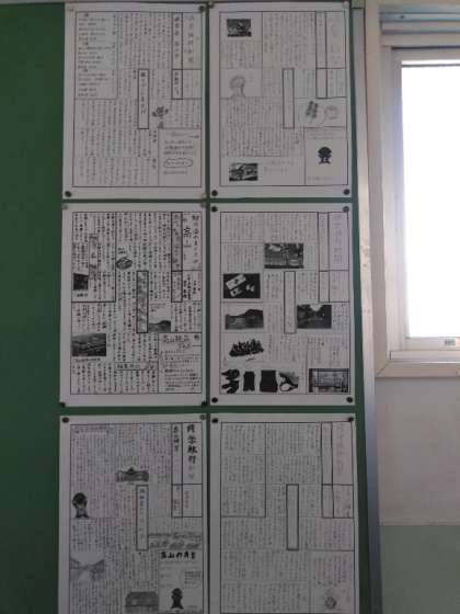 修学旅行の現地を調べた新聞が掲示されています。