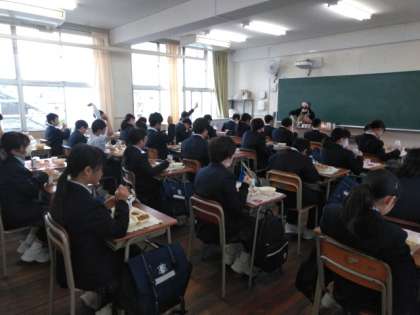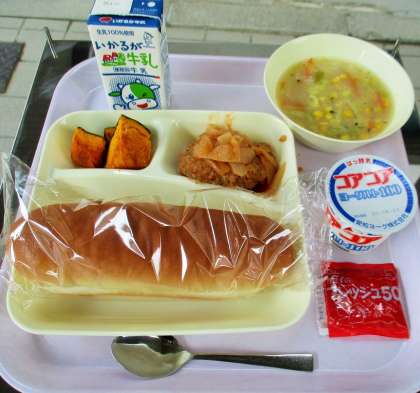 本日のメニューは、生徒たちの大好きな「煮込みハンバーグ」、「野菜入りコーンスープ」「焼きかぼちゃ」かぼちゃでした。