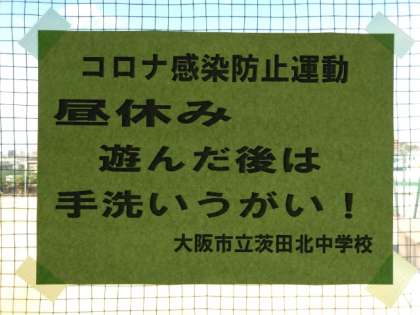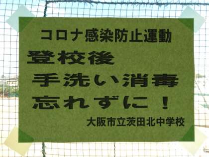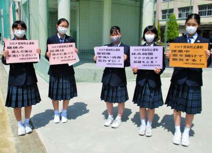 生徒会役員が手にしている「コロナ感染防止運動」のポスター。