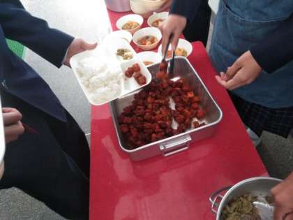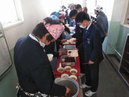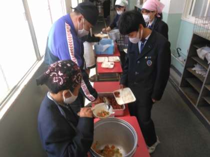 午前の授業が終了し、給食の準備に入りました。