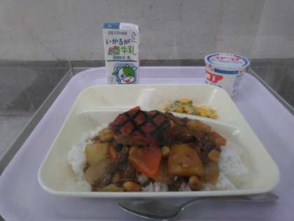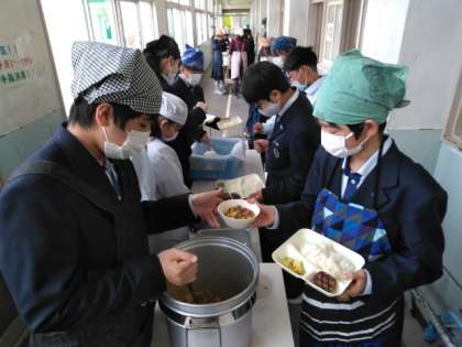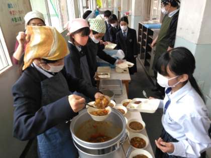 午前の授業が終了し、給食の準備に入りました。