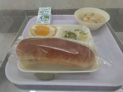 今日のメニューは、「コーンクリームシチュー」「キャベツときゅうりのサラダ」「かわちばんかん」です。