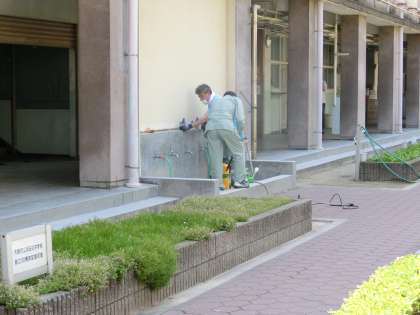 暑い中、今日も管理作業員さんが雑草対策の除草剤を散布してくれています。
