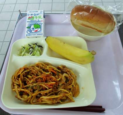 本日の献立は黒糖パン、牛乳、カレースパゲッティ