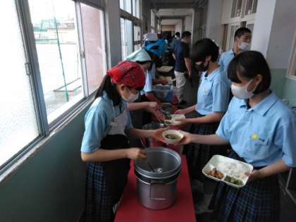 配膳係の生徒諸君は、三角巾、エプロンを!