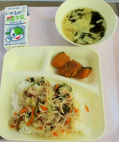ご飯 牛乳 豚丼 湯葉のすまし汁 かぼちゃのしょうゆ焼き