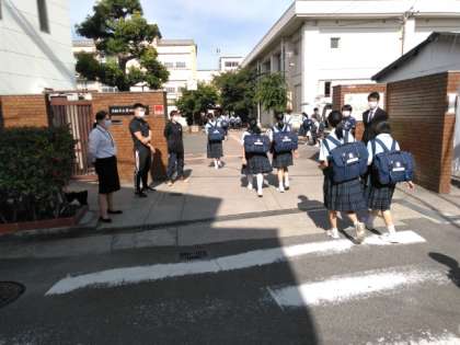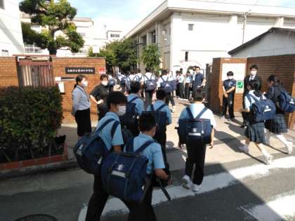 陽が照りつける中、児童さん、生徒たちが登校してきました。