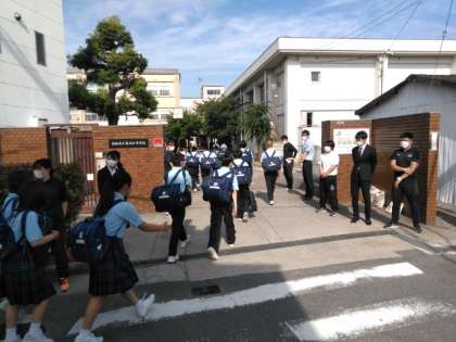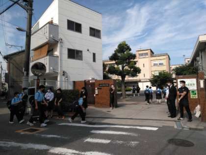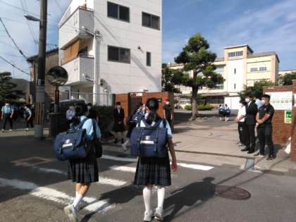 気温上昇の中、生徒たちが登校してきました。