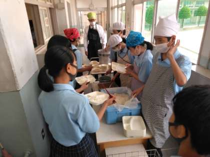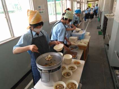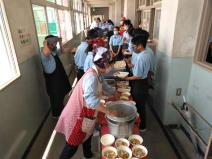 午前の授業が終了し、給食の準備に入りました。