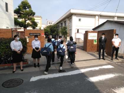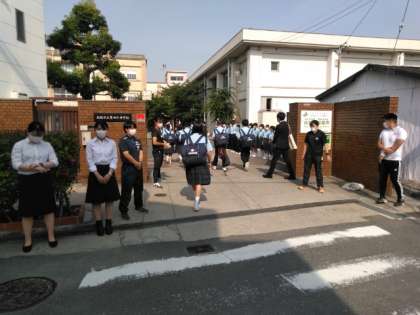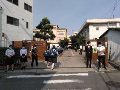 太陽の輝きが厳しい中、生徒たちが登校してきました。
