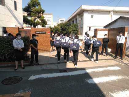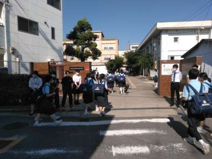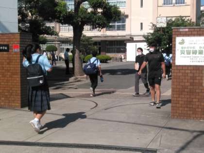 カンカン照りのなか、児童さんや生徒たちが登校してきました。