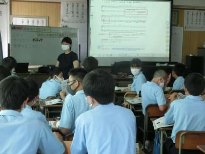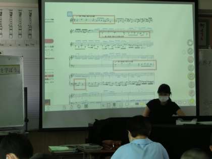 授業展開で、デジタル教科書が活用され、楽曲の特徴がわかりやすく説明されました。
