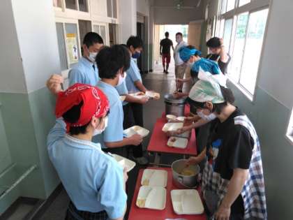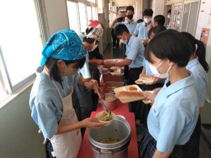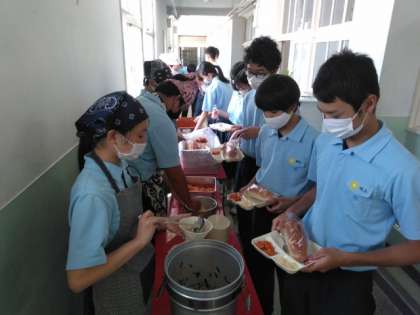 午前の授業が終了し、給食の準備に入りました。