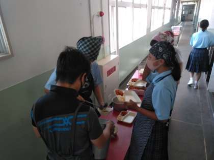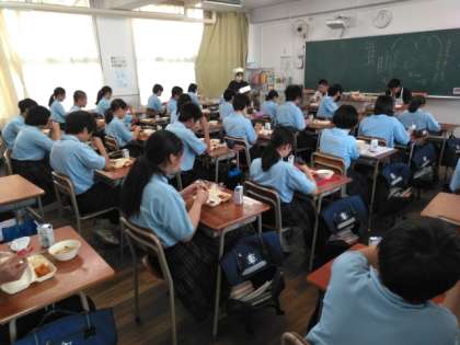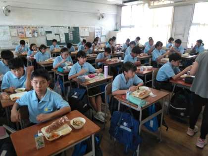 今日のメニューは、「海老のチリソース」「野菜たっぷり中華スープ」「和なし」です。