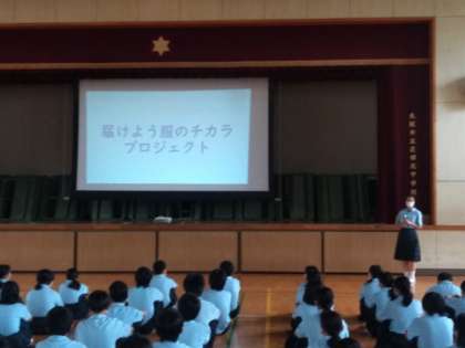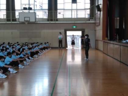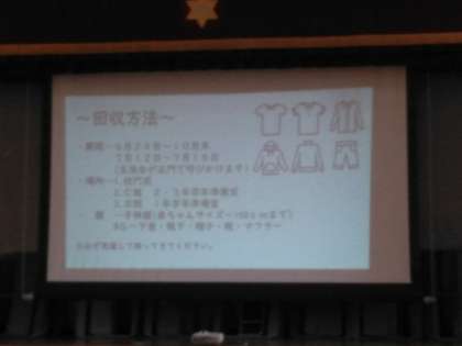 今朝は、生徒会役員から、幼児服のリサイクルについて、取り組みの報告がありました。