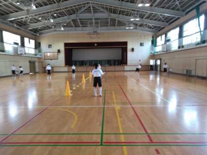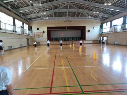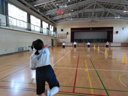 体育館では、女子体育でハンドボール投げの練習です。