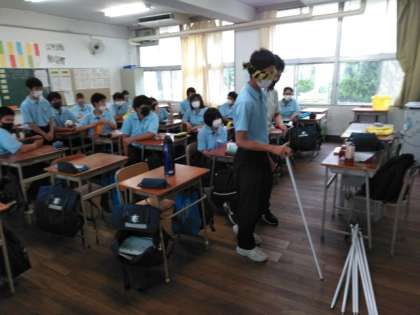 目隠しをして、白杖を使っての歩行練習です。