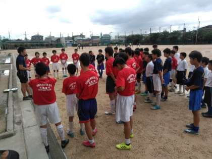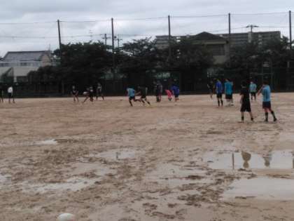雨上がりのグラウンドでは、ラグビー部とサッカー部が活動しています。