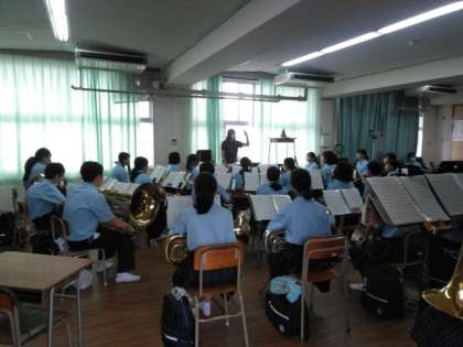 体育館では男子バレーボール部、格技室では卓球部、音楽室では吹奏楽部が練習しています。