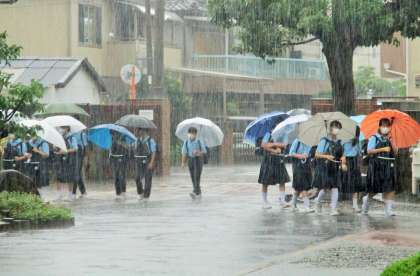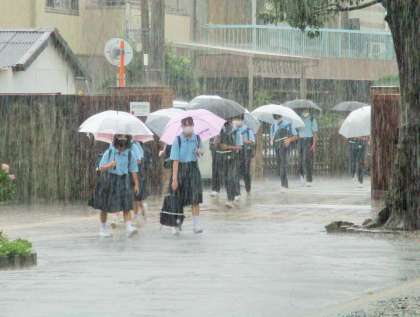 大雨の中 登校です。