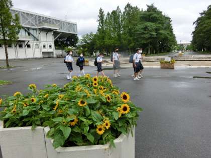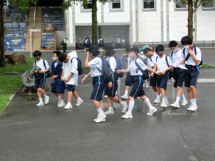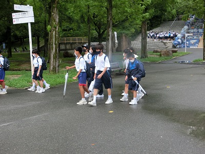 お天気になり、傘をたたみ、合羽を脱いで、体操服姿となりました。