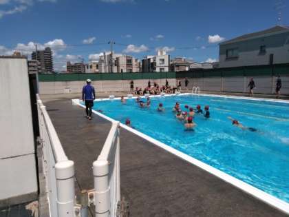 泳法練習後のフリータイム。この暑さの中、気持ちよさそうです。