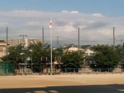 グラウンドの国旗、中庭のひまわりの輝きやセミの鳴き声が応援してくれています。