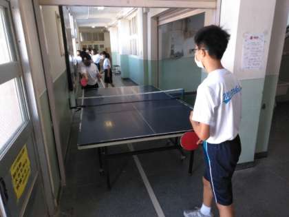 格技室と校舎廊下を使って、卓球部が練習しています。