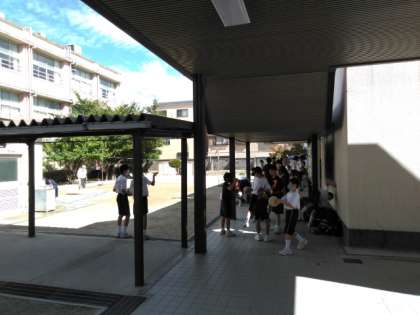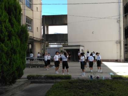 体育館の使えないバレーボール部は、体育館前と中庭で練習しています。