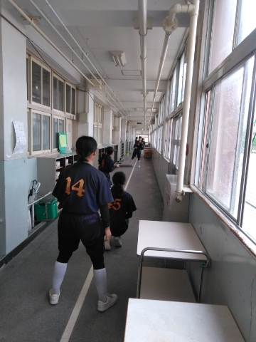 ソフトボール部は廊下でバント練習です。