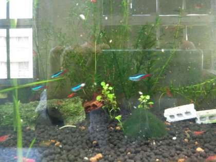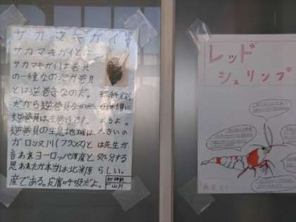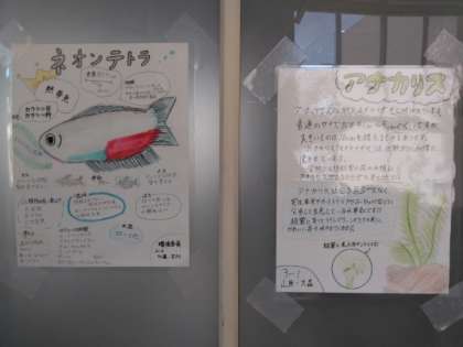 理科室前の熱帯魚。調べ学習の成果が飾られています。